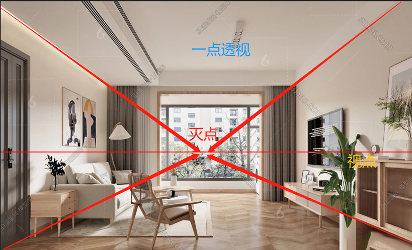 一點(diǎn)透視:為透視點(diǎn)的消失點(diǎn)只有1個(gè)